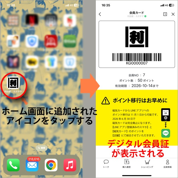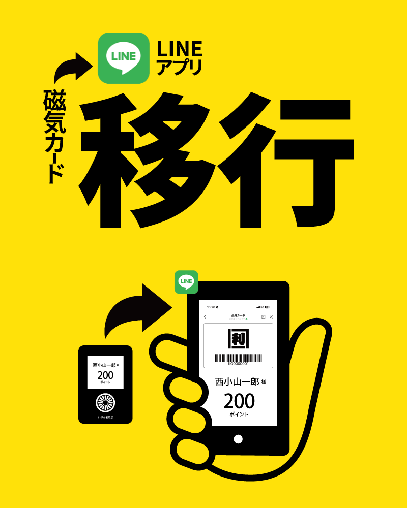 これに伴い、現在ご利用いただいている磁気のポイントカードは、LINEアプリを利用した新ポイント機能(デジタル会員証)へ移行いたします。