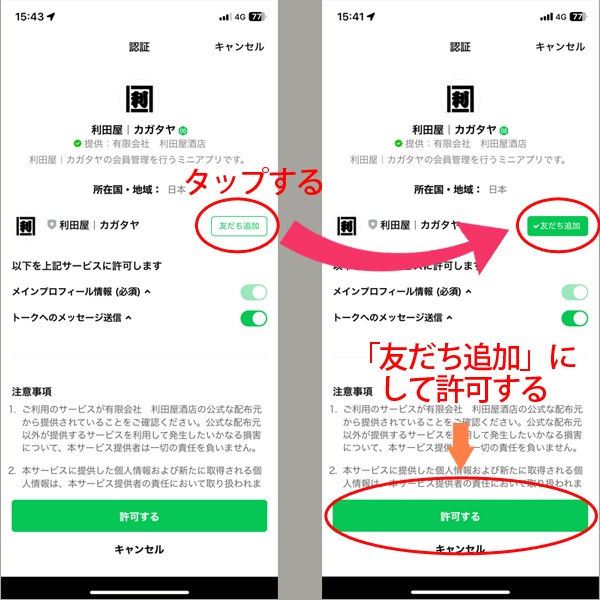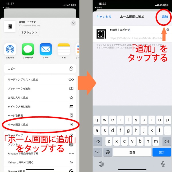 【利田屋|カガタヤ】のアイコンが出てくるので、右上の通り、画面右上の「追加」をタップします。