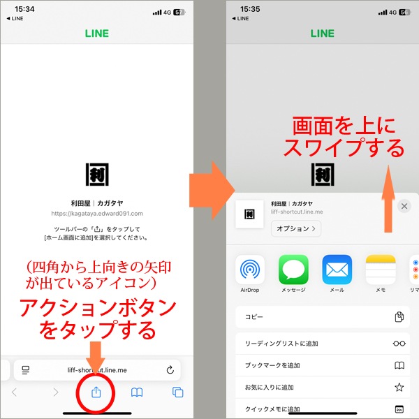 すると右上のように、実施できるアクションのメニューが出てくるので、画面を上にスワイプし、「ホーム画面に追加」ボタンを探してください。