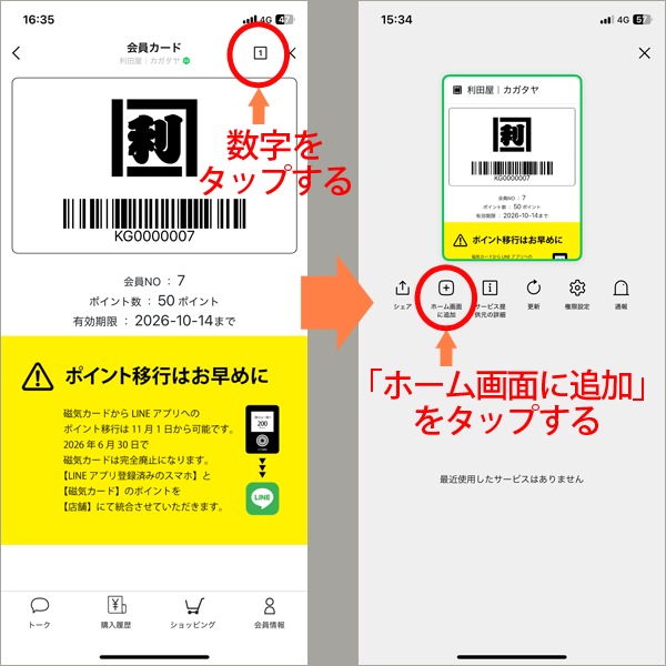【利田屋|カガタヤ】のアイコンをタップすると右上の通り、簡単に会員カード(LINEデジタル会員証)が表示できるようになるので便利です。
