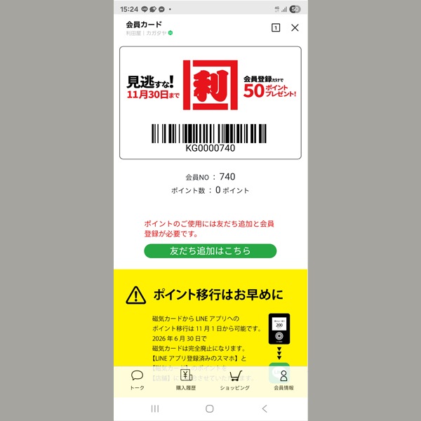 2025/10/3111月1日より利田屋のポイントカードがLINEアプリになります