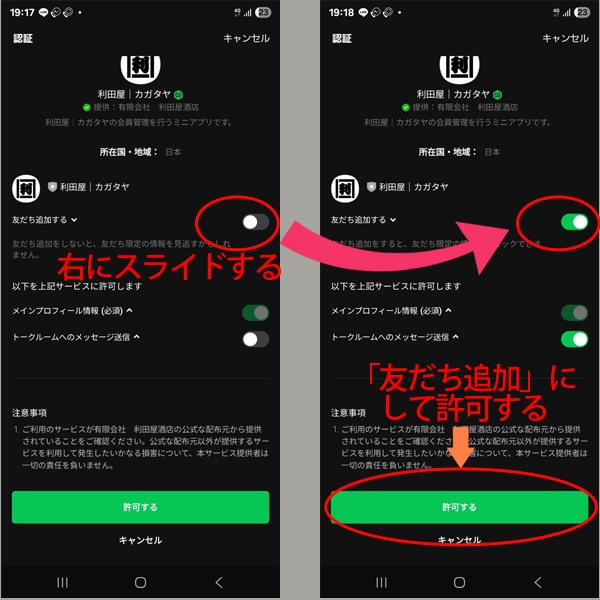 この場合、スイッチが右側でなければ、右にスライドした上で「許可する」ボタンをタップします。