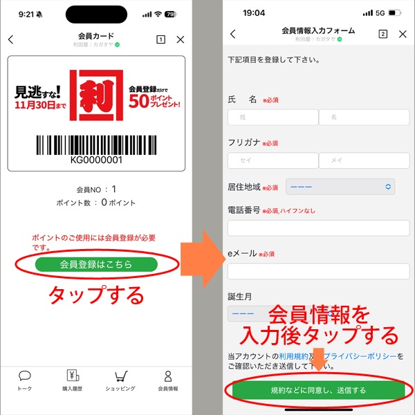 左下「仮会員カード(赤ロゴ)」画面の下部にある「会員登録はこちら」ボタンをタップすると、右下のように「会員情報入力フォーム」が表示されます。